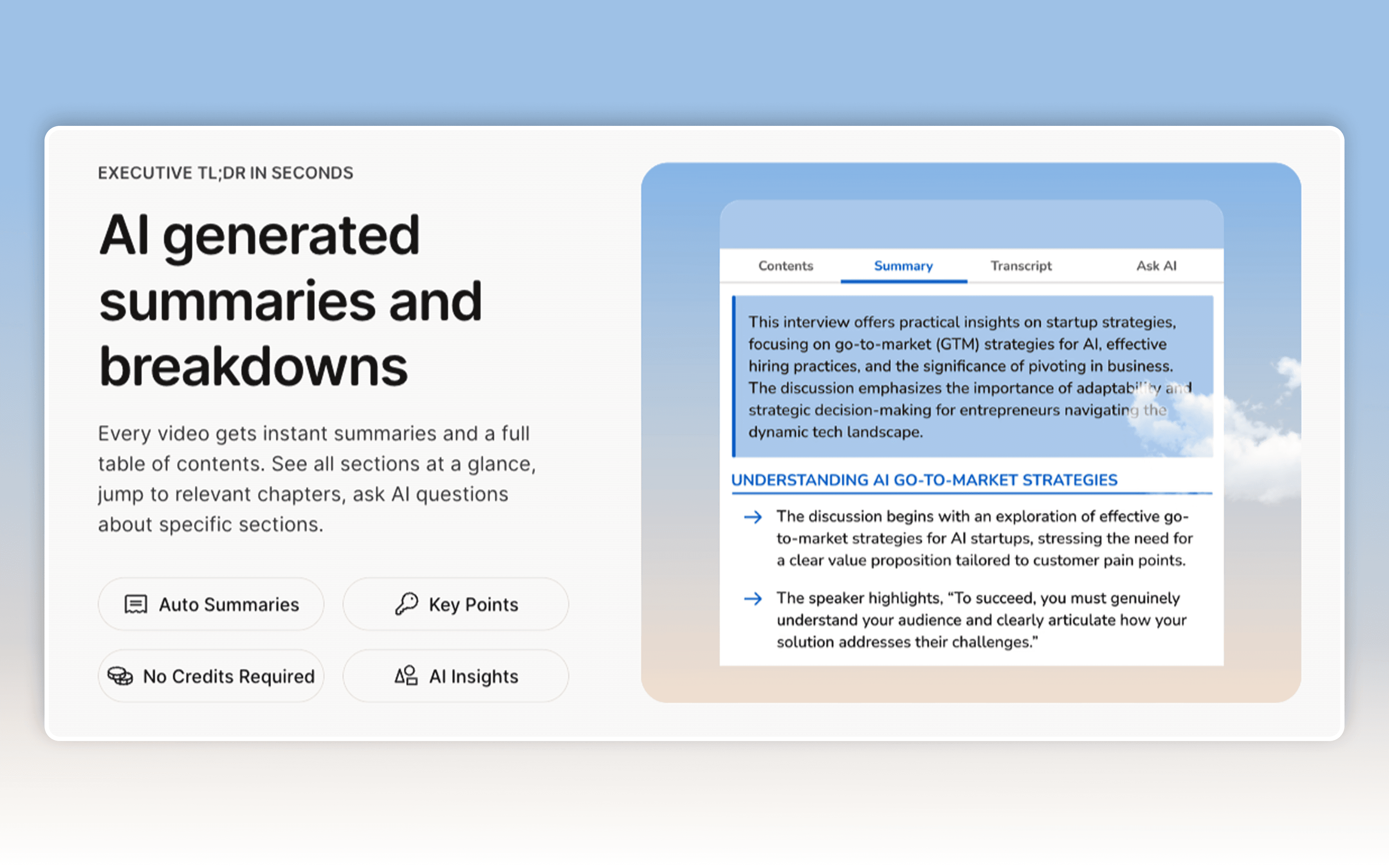 Scripsy provides AI summaries with key takeaways. The output is solid but less structured — you get a summary paragraph and key points, but no chapter breakdowns or highlight extraction.